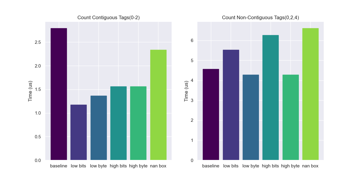 Here we see the opposite of the benchmarks above. The high-bit schemes beat out the low-bit ones. The reason for this is that the optimizer is able to vectorize this operation and can use the SIMD CMHI (compare unsigned high or equivalent in SSE) function to check multiple high tags at the same time. But once again this difference goes away once we are not checking for tag 0.