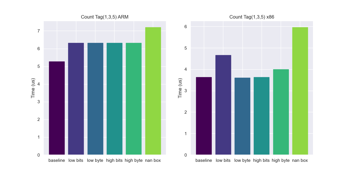 All the methods except for nan-boxing are the same on ARM, but on x86 low-byte and high-bits can be as optimized as the baseline. I didn’t dig into the discrepancy here.